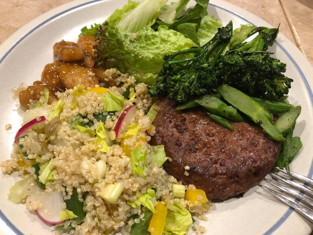上の写真はとある日の夕食。パテ、ブロッコリーソテー、キノアサラダ、
