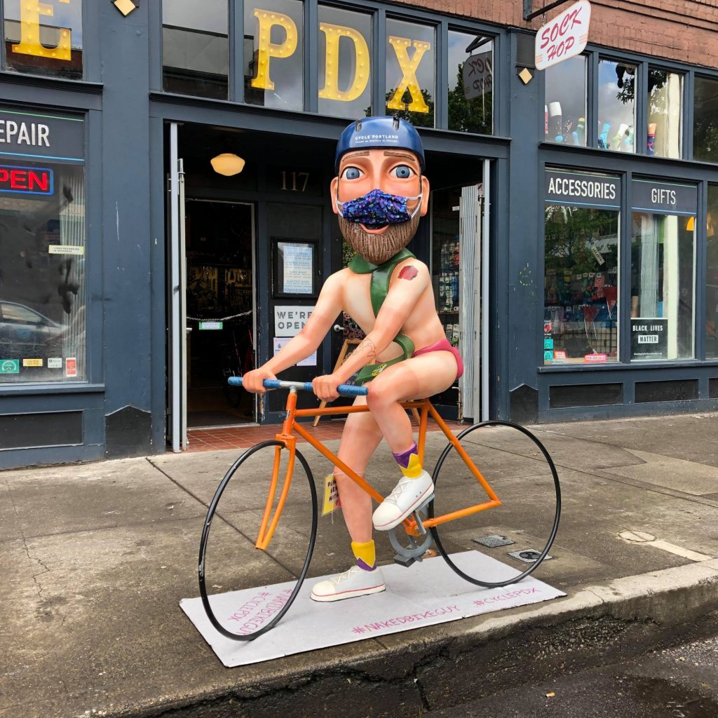 ダウンタウンのバイクショップ前にあるNAKED BIKE GUY(裸のバイク男性)