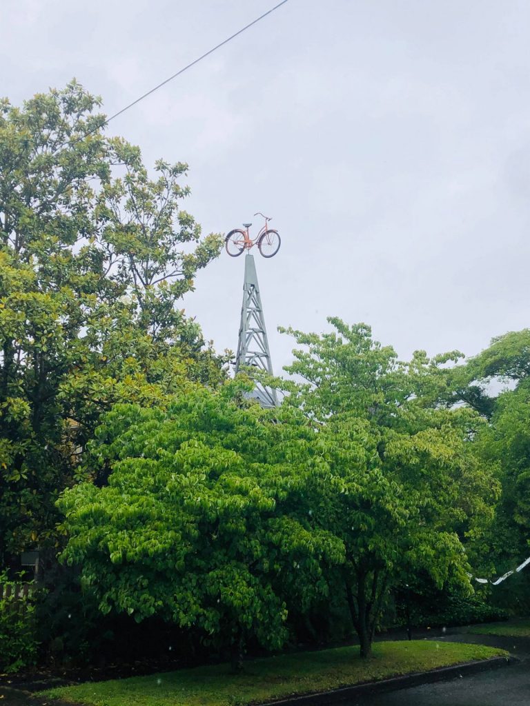 頭上にバイク(自転車)。公園?何かのモニュメント?